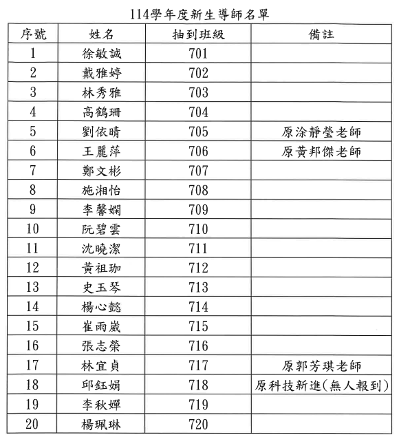 本校114學年度導師名單異動,如圖表。